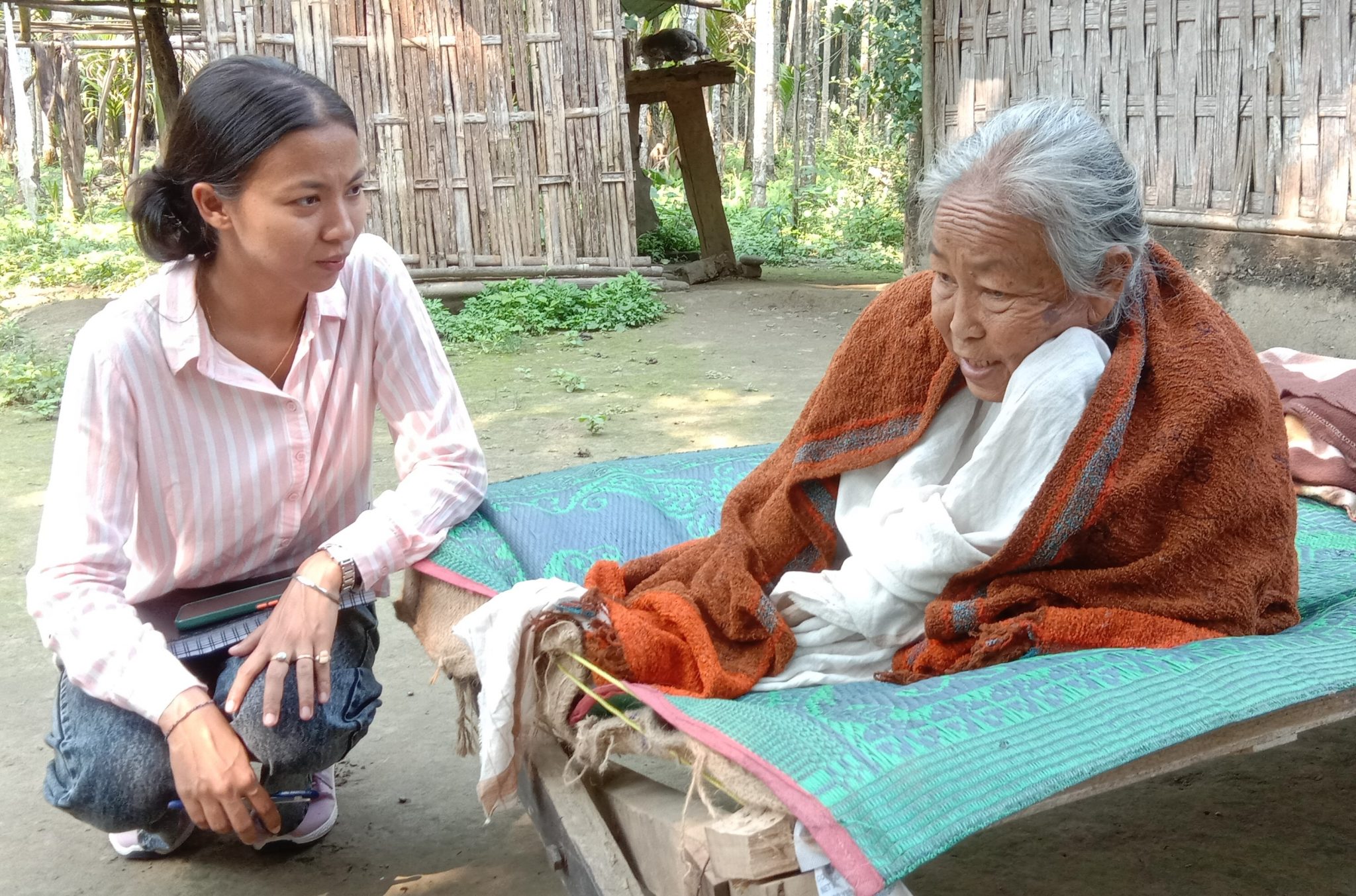 ![]() Menuma Gagoi, immobilised by fear on a bed in front of her bamboo latticed house, speaks haltingly to Rimpee Moran, a member of Aaranyak’s environmental education team. |