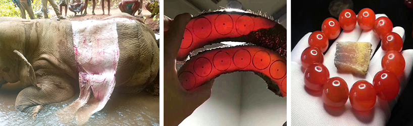 One image shows a trader holding two arcs of dried Asian elephant skin up to the light. To prove that the product is genuine, he’s showing off the deep subcutaneous layers rich in blood vessels that lie beneath the more familiar rough and wrinkled outer layer of grey elephant skin. Marked with circles, the layers are ready to be cut into beads that will be polished to a high shine and turned into bracelets and necklaces. Marketed as traditional wenwan jewellery (a kind of collectible curio) these grisly ‘blood beads’ are being sold to a predominantly Chinese market and threaten a species protected under international law.